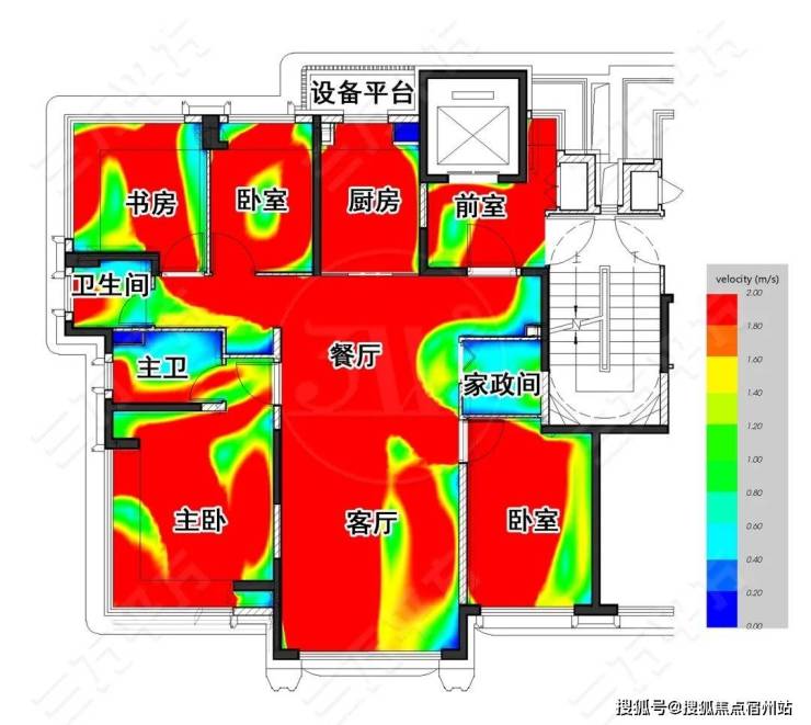 如下图,图上模拟计算的是在春夏季东南风环境下,户内的通风情况.可以看到,大部分房间都有最好的通风条件.