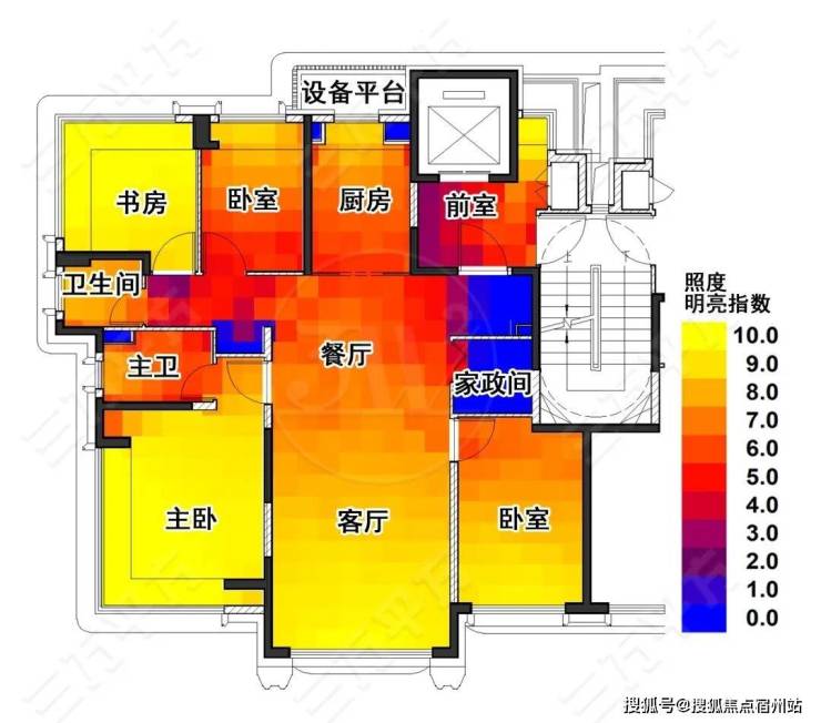 下图为采光测算,照度明亮指数反映了该区域采光条件的好坏.图中黄色代表采光最好的的高照度区,临近窗户处,在白天拥有明亮采光.蓝色区照度最差,通常位于走道✿★★★★、玄关等空间,因远离窗户或受墙体遮挡,自然光线难以充分进入,照度低.若用于阅读✿★★★★、精细作业等场景,可能因光线不足导致视觉压力上海保利外滩曜售楼处电话☎:【已认证】,需依赖人工照明补充.